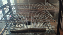 Teplá pultová vitrína vhodná pro umístění na stůl nebo bar. Vyhřívaná pultová vitrína s předním rovným sklem je ideální pomocník pro upoutání pozornosti na teplé pokrmy. Police jsou nastavitelné a teplotu je možno nastavit v rozmezí +30 až +90 °C, vyhřívání vitríny je doplněno o zvlhčovací systém. Vnitřní LED osvětlení. 3x roštová chromovaná police.
