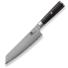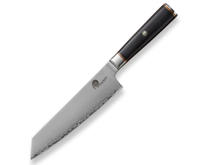Extrémně ostrý nůž Kiritsuke Chef japonského stylu s délkou ostří 8" ze série Dellinger Okami 3 layers z japonské oceli AUS10 s překrásným designem a nejvyšší kvalitou. Nůž je vhodný k běžnému krájení všech potravin od zeleniny a ovoce až po maso. Čepel se zužuje do špičky, jako u klasických šéfkuchařských nožů, ovšem na konci je ještě navíc zkosené ostří. Vyšší fazeta snižuje tření, krájení je tak přesnější. Trojúhelníková oblast hrotu je zvláště užitečná při detailní práci.