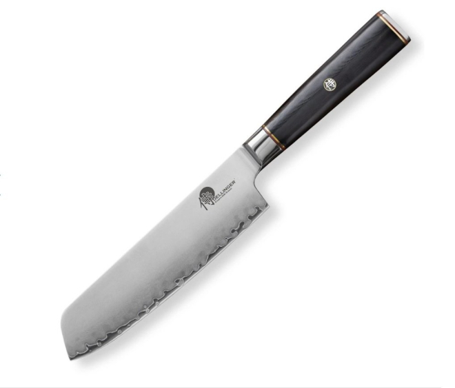 Extrémně ostrý nůž Nakiri japonského stylu s délkou ostří 7" ze série Dellinger Okami 3 vrstvy z překrásného japonského AUS10 s překrásným designem a nejvyšší kvalitou. Svým tvarem nůž připomíná sekáček na maso, ale nechtě se mýlit. S čepelí dlouhou 170 mm snadno nakrájíte veškerou zeleninu na drobné kostičky nebo proužky Výška nože Vám pak umožní nakrájenou surovinu jednoduše nabrat na čepel a přenést do hrnce či pánve.